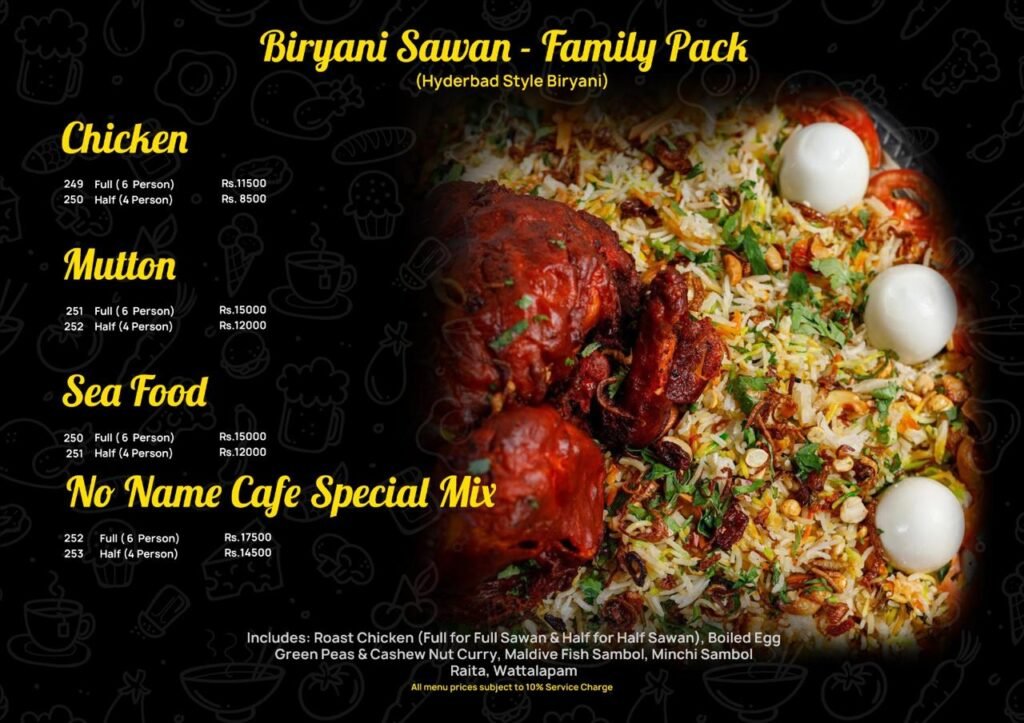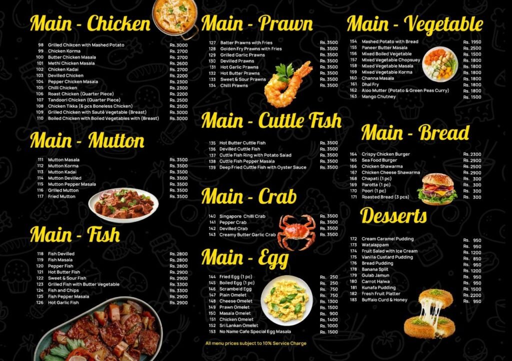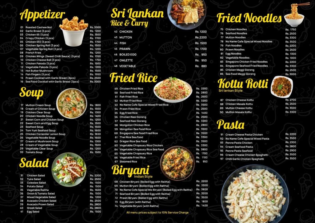 NO NAME CAFE Restuarant Menu Take Away & Dine-in Our specilities Our Dishes dine & drinks Menu Highlights